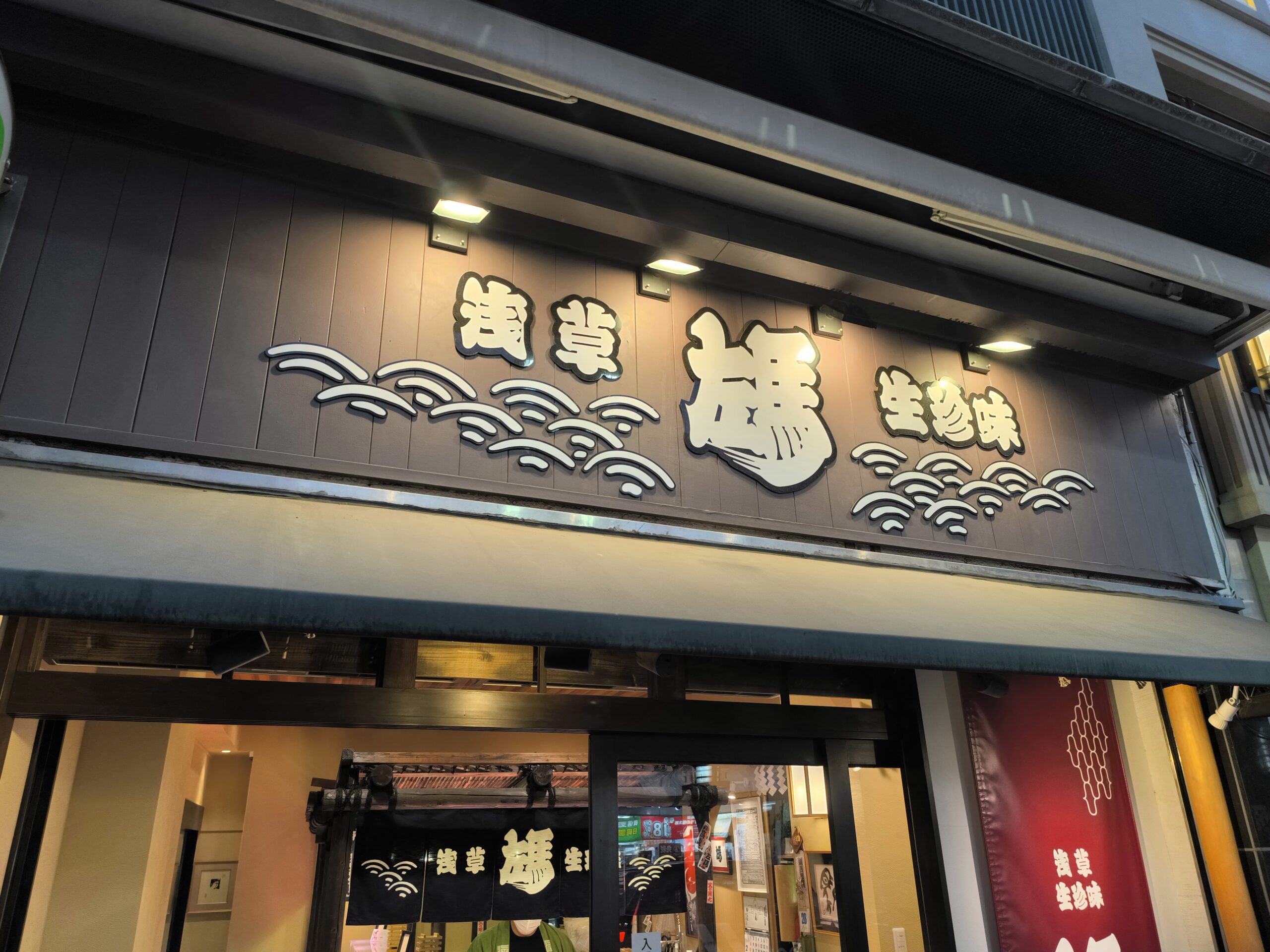浅草駅から少し歩いたところにある浅草一丁目交差点。商店街の方へ入ると「生珍味」の文字が目立つ幟が見えてくる。